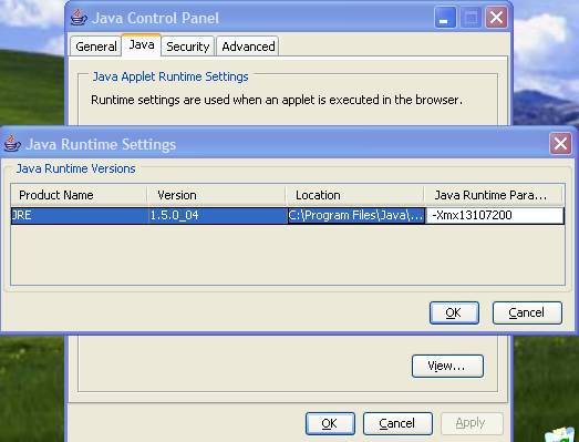 - Click the Java tab and then click View. In the Java Runtime Parameters field, enter